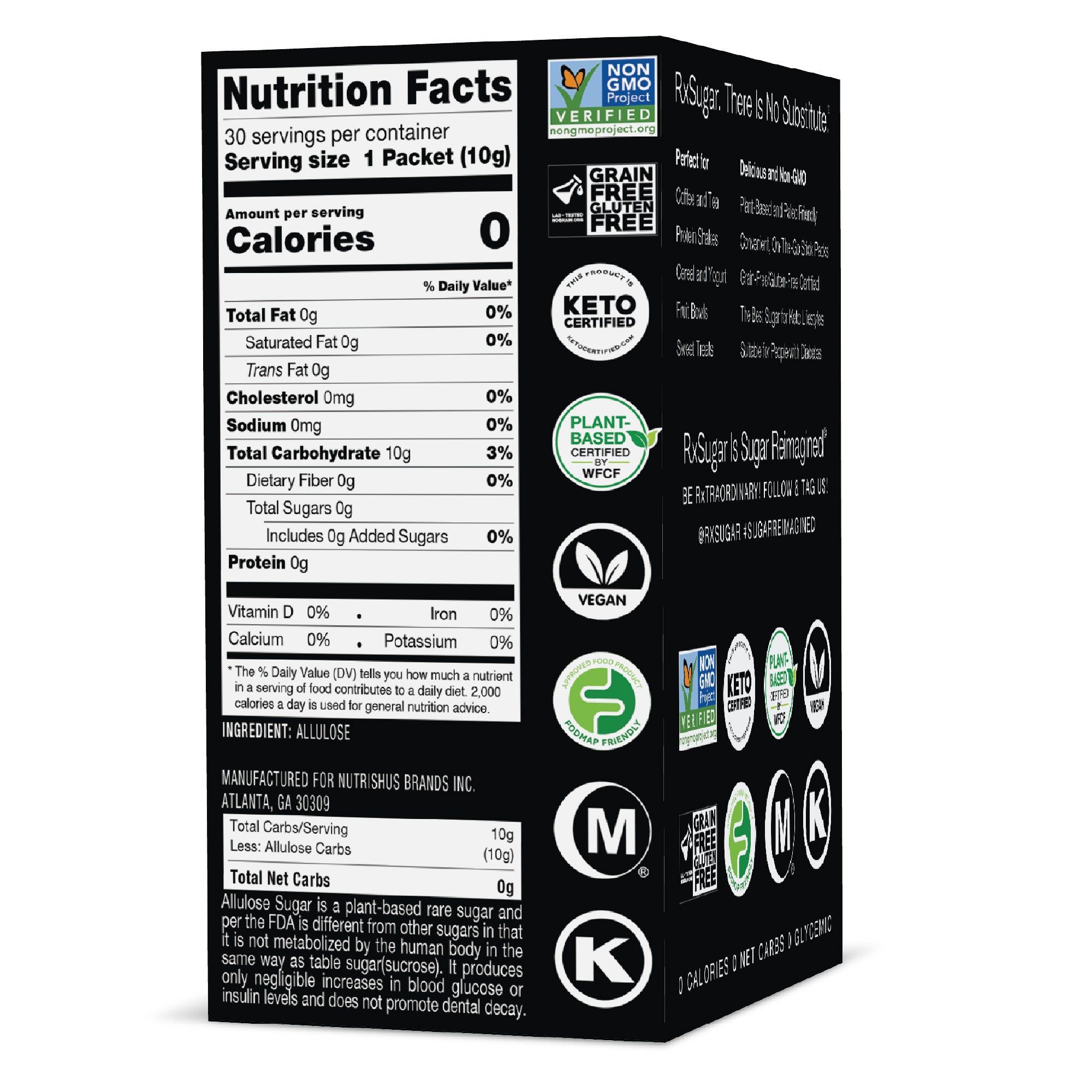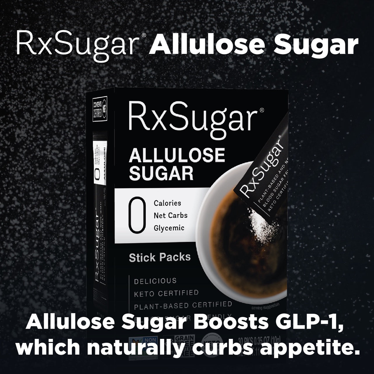 RxSugar® is made from Allulose Sugar, a low calorie plant-based sugar, is different from other sugars in that it is not metabolized by the human body in the same way as table sugar (sucrose). RxSugar® does not affect your blood sugar levels.