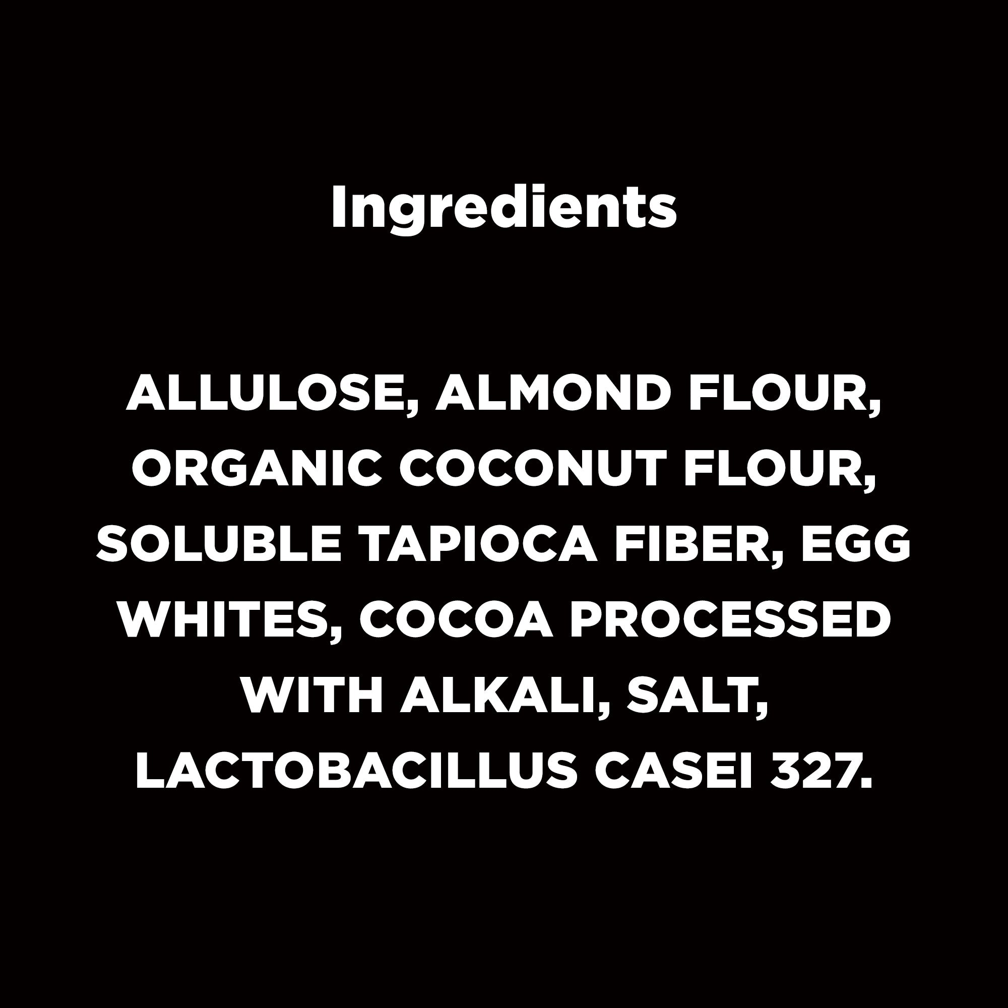 Ingredients: Allulose Sugar, Almond Flour, Organic Coconut Flour, Soluble Tapioca Fiber, Egg Whites, Cocoa Processed with Alkali, Salt