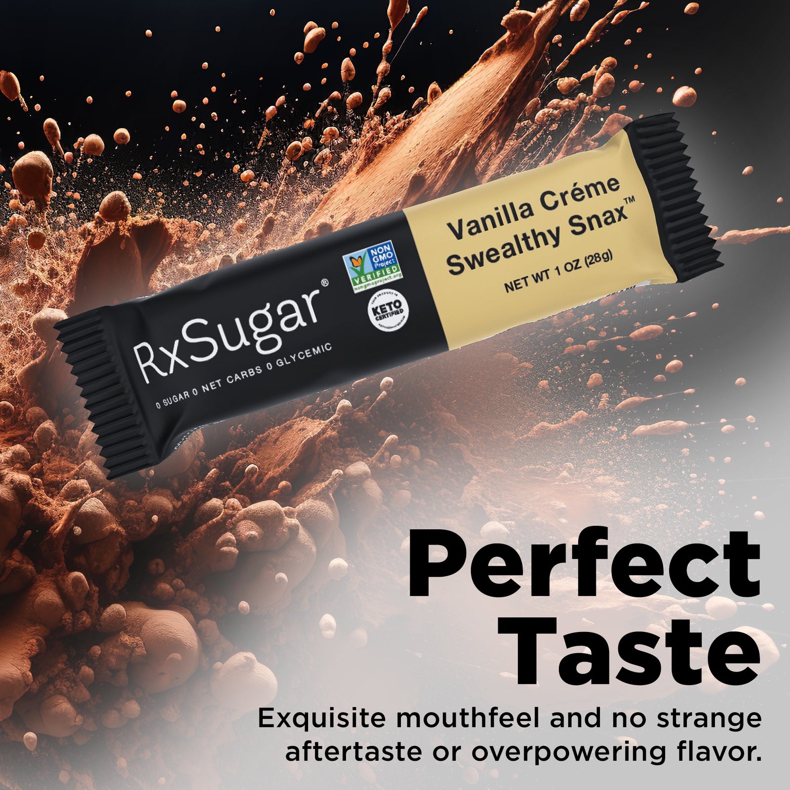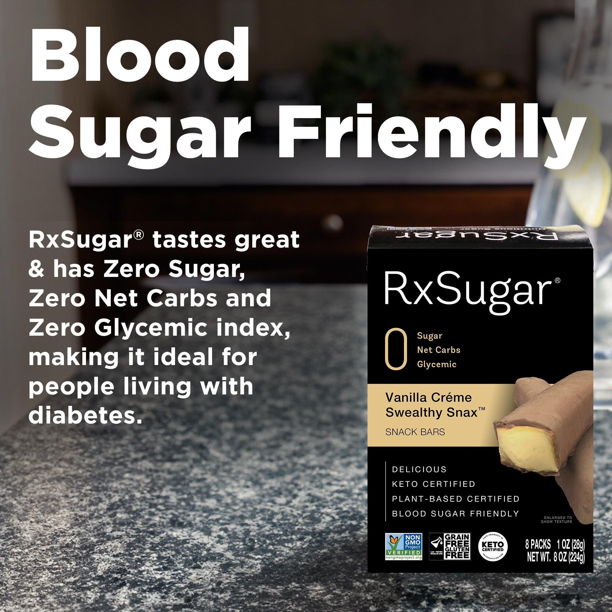 Grain-Free/Gluten-Free, Keto Certified, FODMAP Friendly, and made with clean, plant-based ingredients—RxSugar® Swealthy Snax Candy Bars redefine indulgence with no compromises.